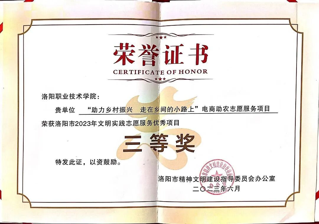 经过前期申报、筛选、专家评审、媒体公示,分别评选出一等奖项目7个,二等奖项目10个,三等奖项目10个。其中,洛阳职业技术学院申报的电商助农志愿服务项目“助力乡村振兴·走在乡间的小路上”荣获三等奖。