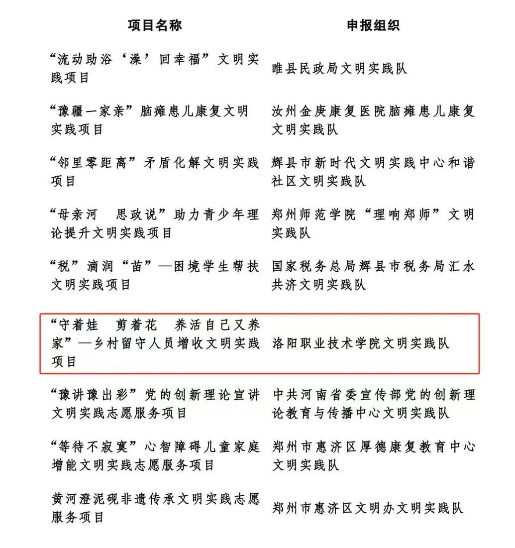 近日,省文明办公布了河南省2024年文明实践示范培育项目名单,洛阳职业技术学院项目“守着娃、剪着花、养活自己又养家——乡村留守人员增收文明实践项目”成功入选,获评一类示范培育项目,取得学校文明实践项目省级成果零的突破。