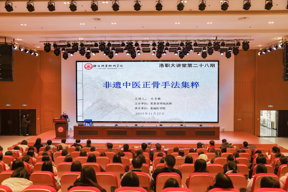 11月27日下午,洛职大讲堂第28期在大学生活动中心一楼报告厅举行。国家级非物质文化遗产项目“中医正骨疗法(平乐郭氏正骨法)”代表性传承人、洛阳职业技术学院基础医学院名誉院长毛书歌应邀作专题讲座。副校长任扬出席讲座。